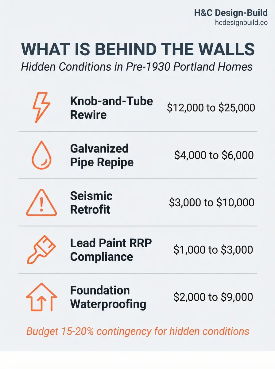 Open a wall in a 1920s Craftsman and you'll find conditions that no home inspection catches from the surface. Common discoveries include knob-and-tube wiring, galvanized pipes, balloon framing without fire blocks, lead paint, asbestos, and unreinforced foundations. Here's what Portland contractors pull out of these houses regularly.