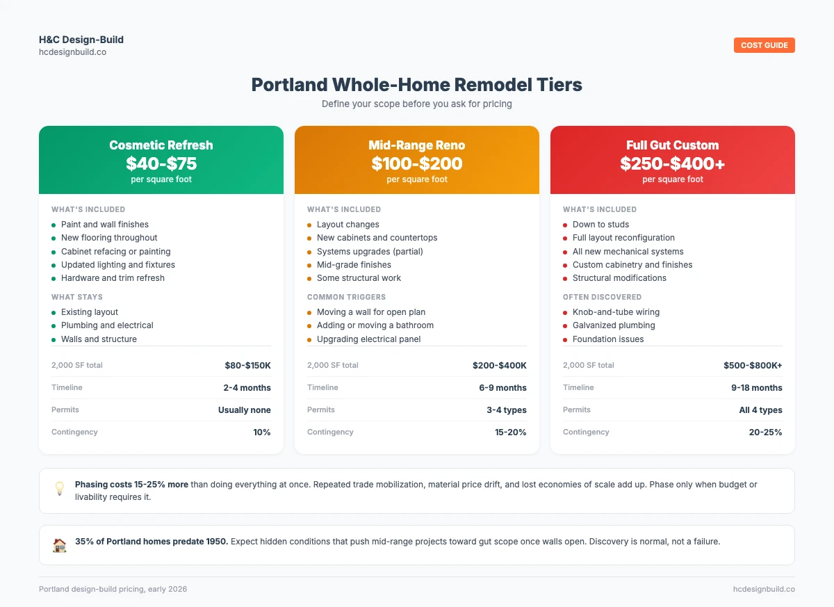 Portland whole-home remodel costs depend on scope. Cosmetic refreshes run $40-$75 per square foot. Mid-range renovations with layout changes and systems upgrades run $100-$200 per square foot. Full gut customs start at $250 per square foot and climb from there.
